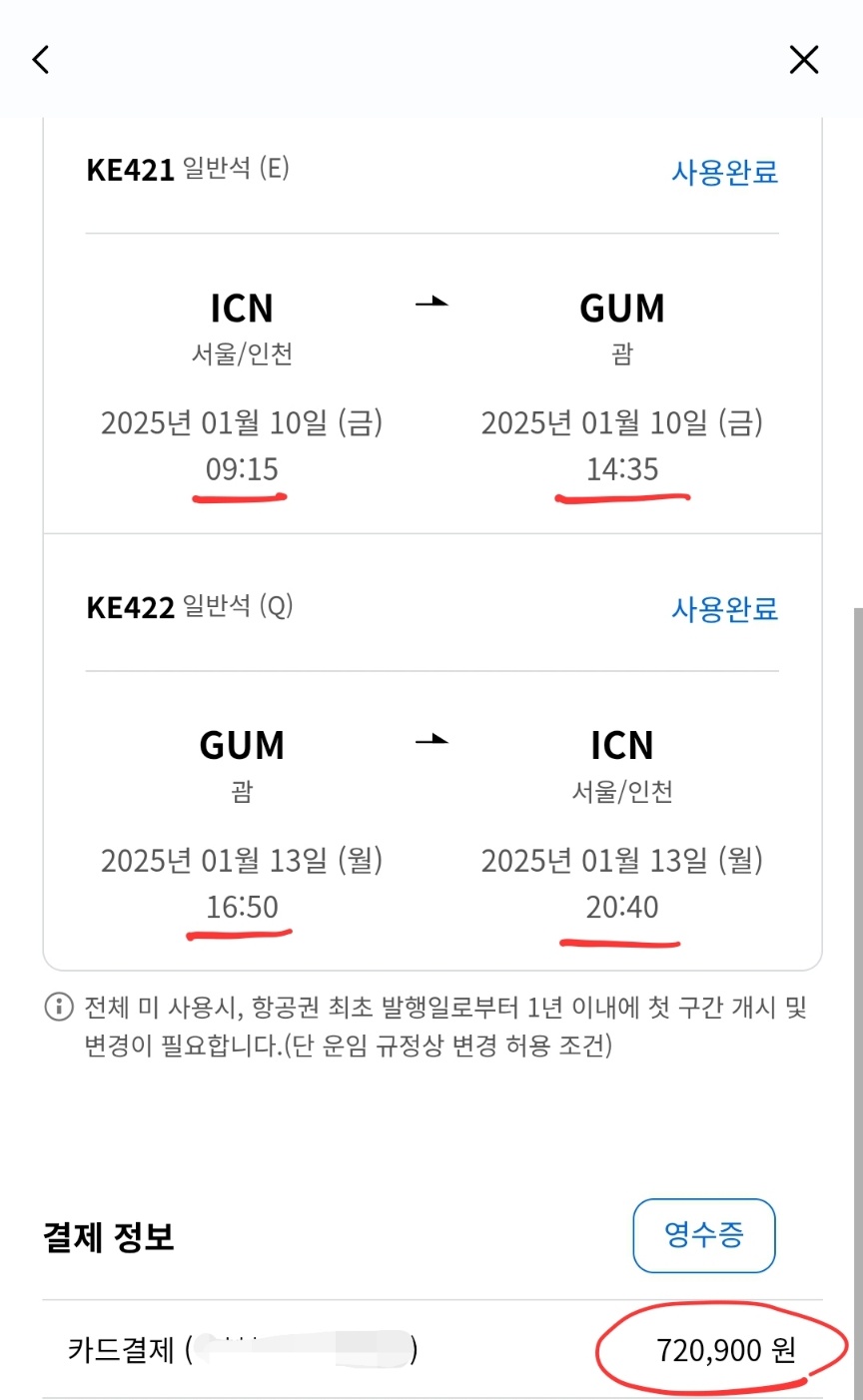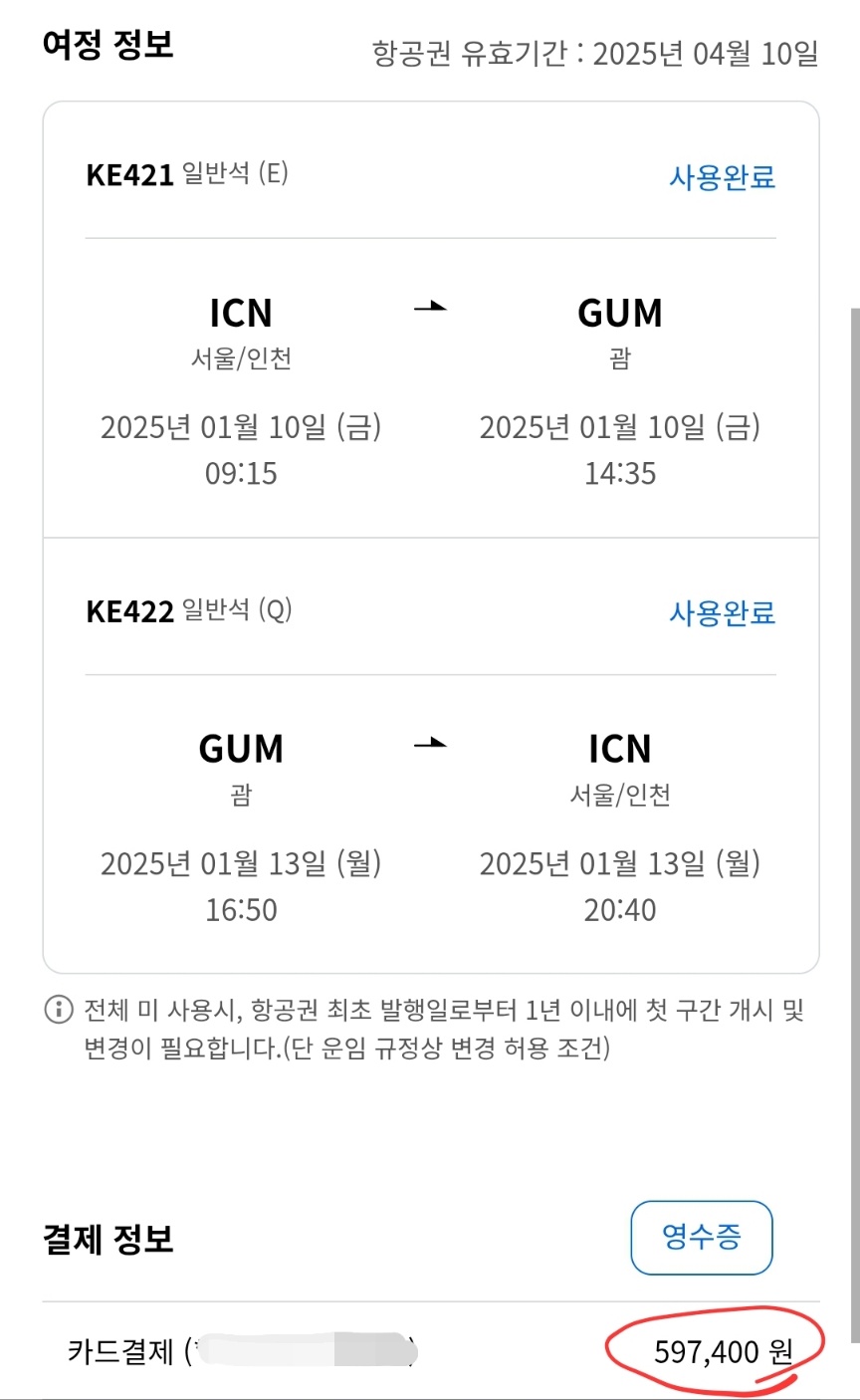 여행지를 괌으로 결정된 이후 가장 먼저 한 일은 비행기표를 예매하는 것입니다. 원하는 날짜와 시간에 예매를 원한다면 가능한 빨리 예매하시길 추천드립니다. 물론 가격적인 매리트도 있습니다. 비행기표 예매 전에 저가항공과 대한항공 둘 중 고민을 많이 했습니다.