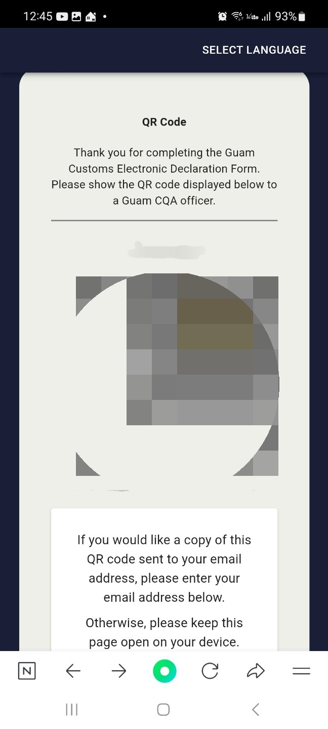 6) 작성이 완료가 되면 QR코드가 생성됩니다. 이 QR코드를 미리 캡처해 놓으시고 괌 입국 시 세관원에게 보여주면 특별한 질문 없이 바로 통과가 됩니다.