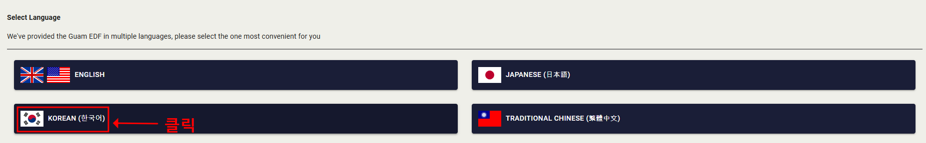 2) 한국어 버전으로 바꿔서 작성하면 더 편리합니다. 홈페이지 오른쪽 상단 [SELECT LANGUAGE]를 클릭해 주세요.