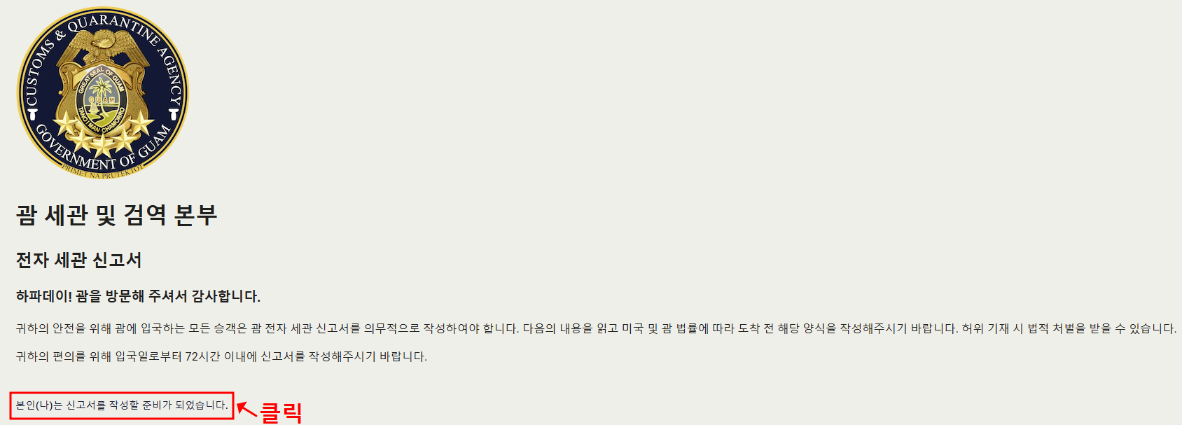 [본인(나)는 신고서를 작성할 준비가 되었습니다.]를 클릭해 주세요.