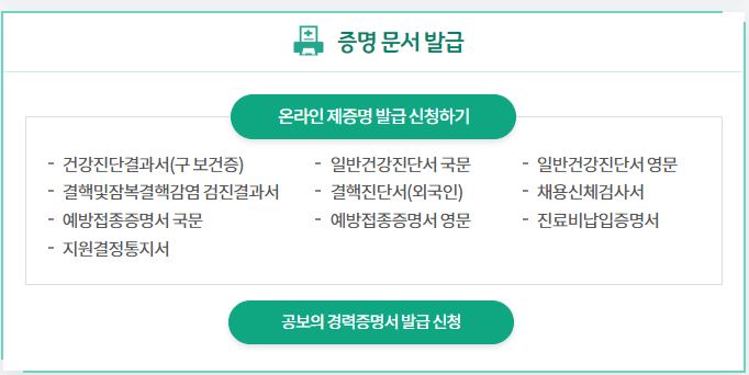 보건복지부와 한국사회보장정보원이 운영하는 온라인민원 서비스,건강진단결과서(구 보건증) 등 제증명 발급, 의료비지원 등 안내