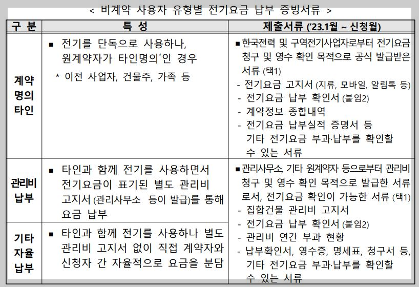 ● [비계약 사용자]는 유형별 전기요금 납부 증빙서류를 제출해야 합니다. 아래 표를 참고하시기 바랍니다.