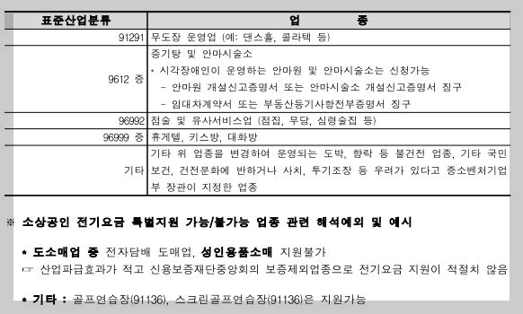 연매출 6천만 원 초과 소상공인 중 [소상공인 전기요금 특별 지원 제외 업종]은 지원 제외