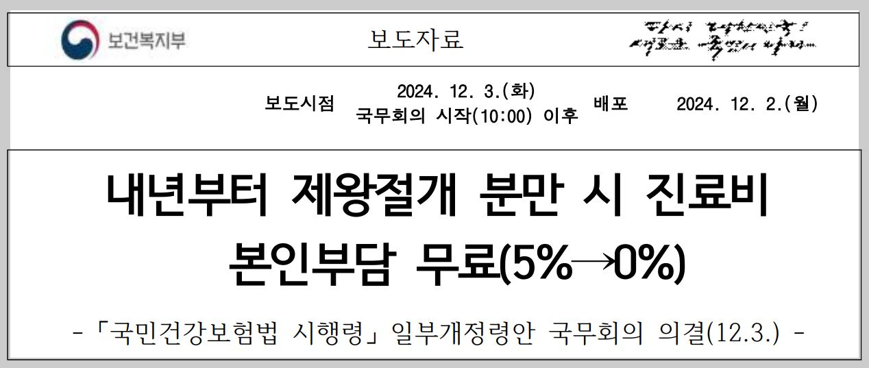 제왕절개 분만건수 비중은 '19년을 기점으로 전체 분만건수의 절반 이상을 차지하며 매년 증가하는 추세를 보이고 있으나, 그간 자연분만은 진료비 본인부담이 없는데 비해 제왕절개 분만은 요양급여비용 총액의 5%를 환자가 부담해 왔다. 저출생 추세 반전을 위해서는 임신과 출산을 원하는 부부에게 도움이 되는 것을 획기적으로 지원할 필요가 있다는 현장의 목소리와 이를 반영한 [저출생 추세 반전을 위한 대책('24년. 6월 저출산 고령사회위원회, 관계부처합동)'이 수립발표됨에 따라 그 후속 조치 중 하나로 이번 시행령 개정을 통해 2025년 1월 1일부터는 제왕절개 분만 시 자연분만과 동일하게 진료비 본인부담을 현 5%에서 0%로 무료화하였다