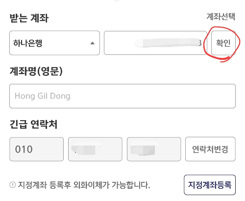 10) 자동입력된 계좌번호를 확인하신 후 계좌선택 아래 있는 [확인] 버튼을 눌러 주세요. [확인] 버튼을 누르면 아래 [긴급 연락처]는 자동 입력이 됩니다.