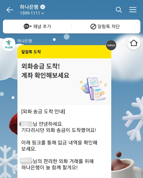 15) 외화를 보낸 하나은행에서 [외화송금 도착] 알림톡으로 외화가 잘 이체되었다는 메세지가 옵니다.
