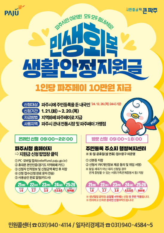 ● 지급 시기: 신청 접수 후 익일 오후부터 파주페이로 지급되며, 즉시 사용 가능합니다.