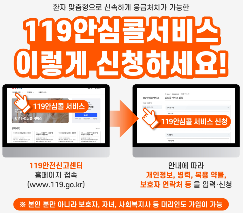 119안심콜 서비스는 소방청에서 제공하는 맞춤형 응급 서비스로, 미리 본인이나 가족의 질병 정보, 병력, 복용 중인 약, 보호자 연락처 등을 등록해 두면 위급상황 발생 시 119 신고만으로도 구급대원이 즉시 관련 정보를 확인하고 빠르고 정확한 응급처치를 해주는 서비스입니다.