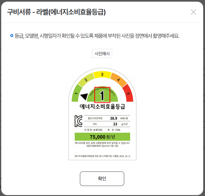- 에너지효율등급 라벨 사진 : 등급, 모델명, 시행일자가 확인될 수 있도록 제품에 부착된 사진을 정면에서 촬영