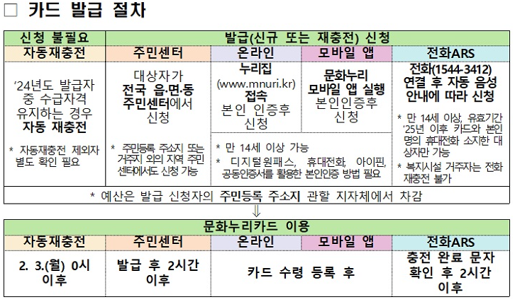 ✔ 2024년에 문화누리카드를 발급받아 사용 이력이 있고, 2025년에도 수급 자격을 유지하는 분들은 별도의 신청 없이 자동으로 2025년 지원금이 자동 재충전됩니다. 자동 재충전 여부는 2월 3일 이후 주민센터, 누리집, 모바일 앱, 또는 전화(ARS 1544-3412)를 통해 확인할 수 있습니다.